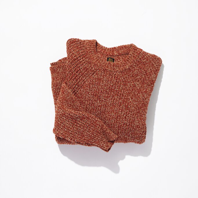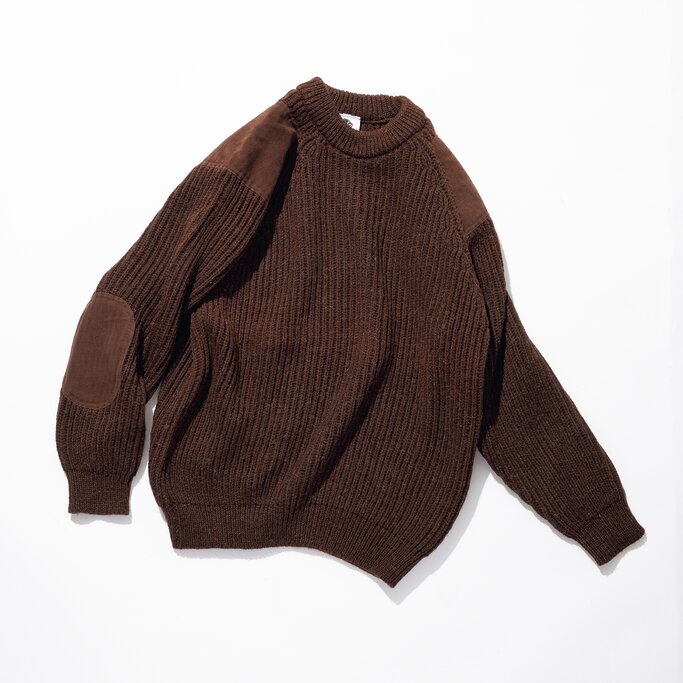 シェットランドウールにアルパカをブレンドし、ツイード調に編み立てた厚手のクルーネックセーター。ツイード見えする分、英国らしい雰囲気を出したいときに重宝する。3万7400円(バトナー TEL03-6434-7007)