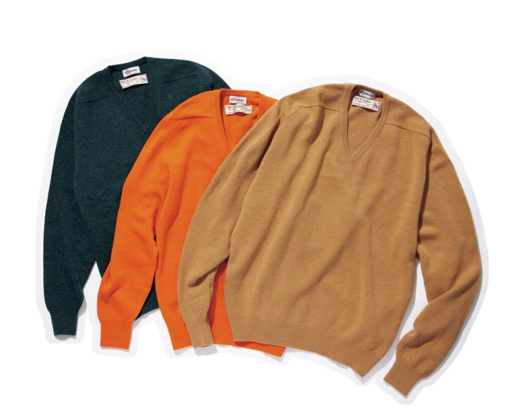 スーパー・ジーロンラムズ・ウールと呼ばれる毛糸を使った美しい配色のVネックセーター。作れる工場が激減し、あまり見かけなくなったサドルショルダー仕様もポイント。各5万9400円(三角形 TEL03-6438-9309)