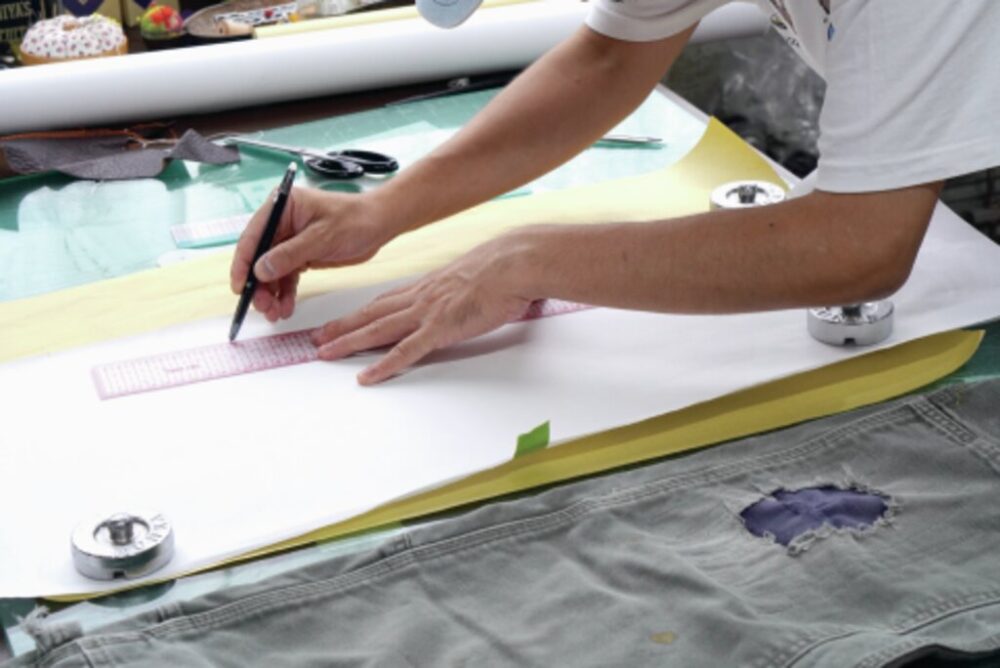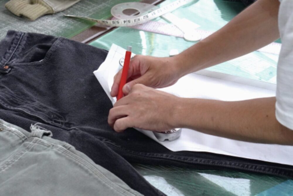 ベースとなるパンツに型紙を合わせ、縫う場所をチャコペンで書いていく。