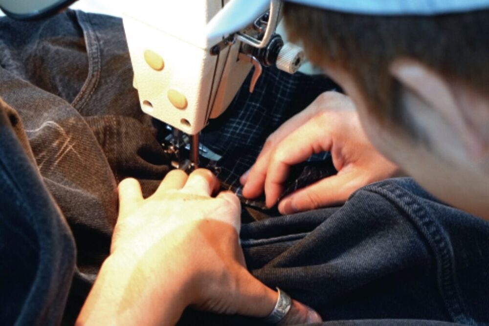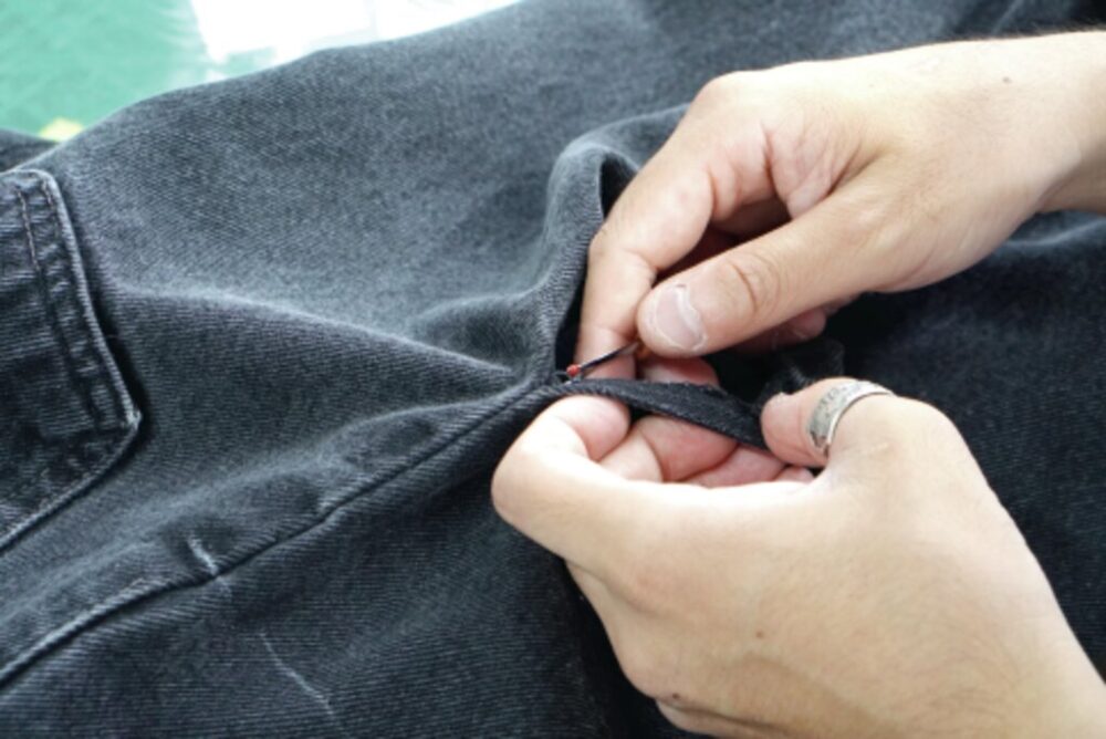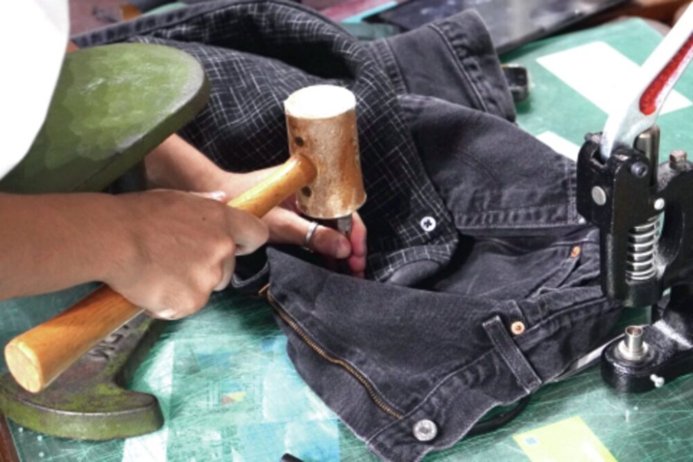 最後に、デニムらしくダブルニー部分にリベットを打っていき、完成!