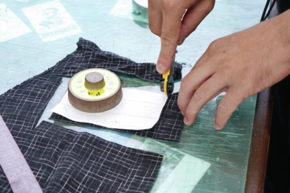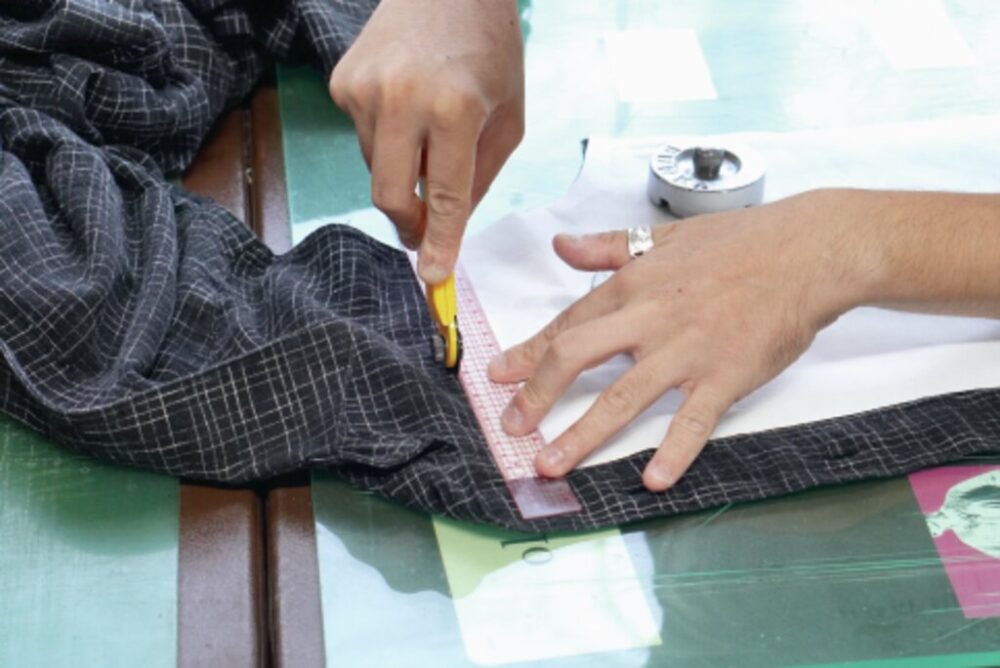 パンツに移植するダブルニー部分の生地をシャツから切り出していく。