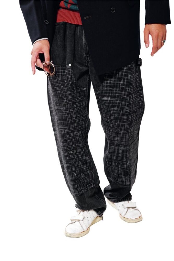 ブラックデニムにシャツ生地を縫い付け、ダブルニーのパンツに!ブラックデニムに同系色のシャツを合わせることで派手すぎない、いい塩梅のリメイクに仕上がった。