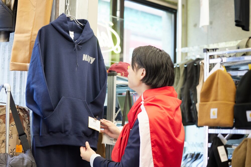 真っ先に目についたのが、スポーティな雰囲気のスウェットパーカ&パンツ。〈ソフィ〉のアメリカ海軍で採用されているトレーニング用スウェットパーカのセットアップは生地が肉厚で手触りも◎。「この上にブレザーを羽織ったらちょうどいいスポーツミックスが完成しそう!」と興奮している様子だ。