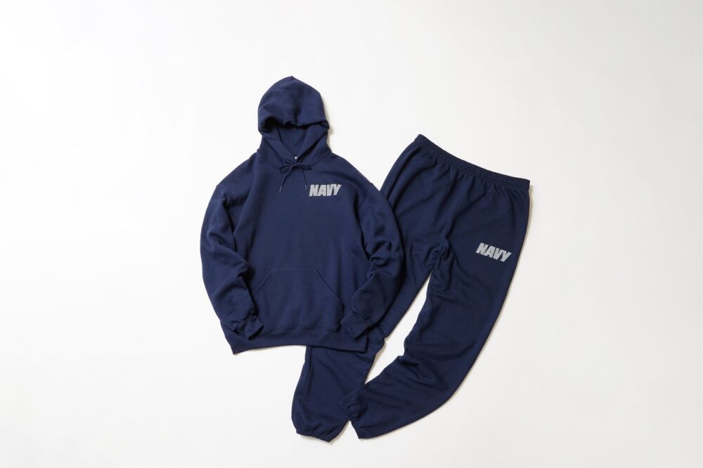 アメリカ海軍で採用されているトレーニング用スウェットパーカとパンツ。速乾性に優れ、着心地も柔らかな9オンスのコットンポリエステル素材を採用した裏起毛仕様で、フードはボリュームのある2枚仕立て。リフレクタープリントによるNAVYロゴがアクセントに。メイド・イン・USAなのも嬉しいポイントだ。パーカ7920円、パンツ6930円
