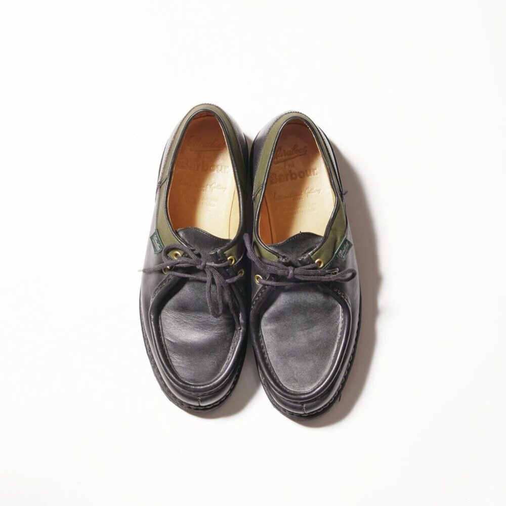 パラブーツ×バブアー×インターナショナルギャラリー ビームスのトリプルネーム。[ミカエル]の履き口にワックスドコットンが張り付けられたデザイン