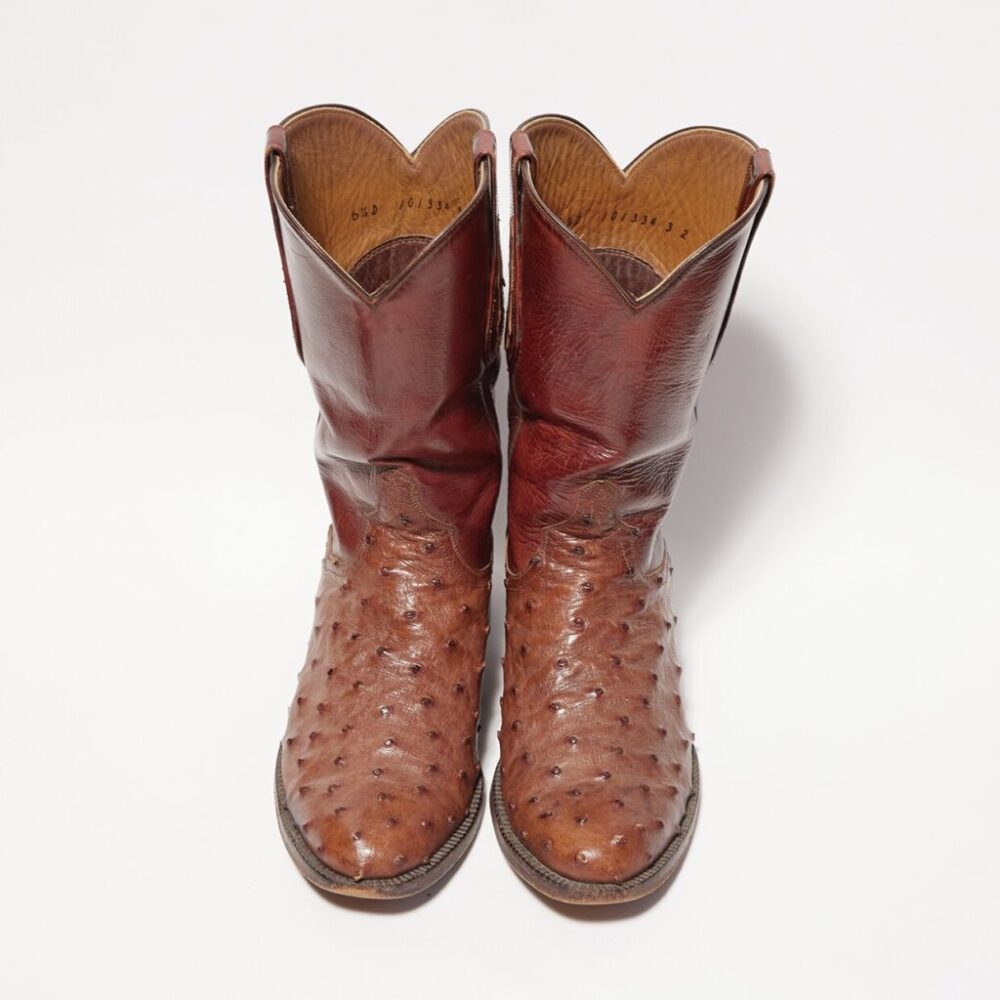 J.B.ヒルのウエスタンブーツ。表情豊かなオーストリッチ製のブーツはシャフトが細く、ジャケパンスタイルと合わせることが多い。ピッチの細かいステッチなど職人技が光る