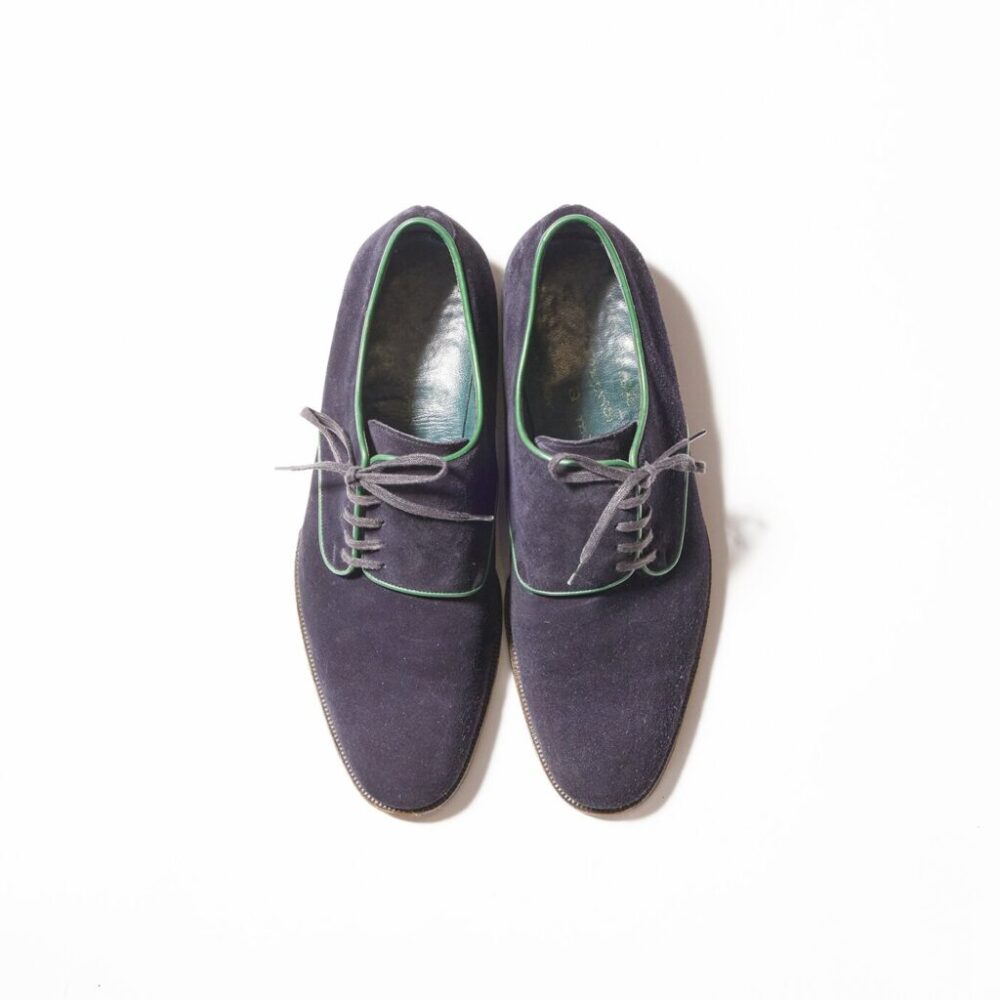エンツォ ボナフェ×ビームスのサイドレースシューズ。グリーンのパイピングとネイビースウェードが好相性