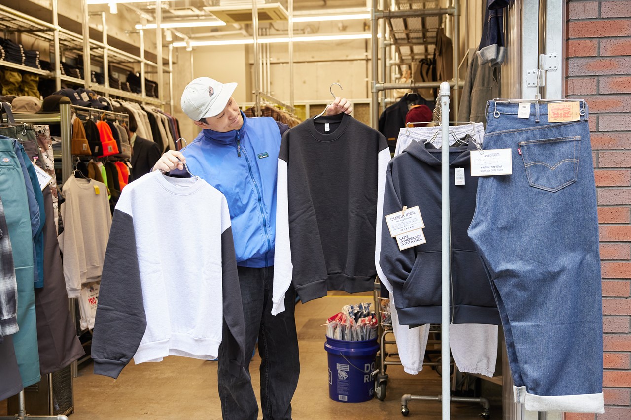 袖とボディがツートンカラーの配色になっている珍しい「ロサンゼルスアパレル」を発見。実はこれ、実店舗総店長を務める土屋さんがリメイクしたもの。