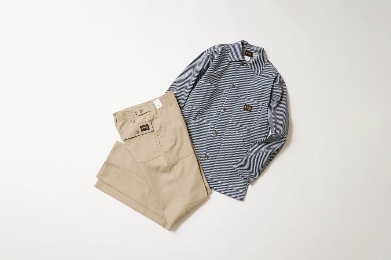ヒッコリーのカバーオールとカーキのベイカーパンツはどちらも「スタンレイ」。1972年にアメリカ・テキサス州で創業した「アールズアパレル」によって作られ、リーズナブルで質実剛健なアイテムはアメカジフリークから絶大な人気を誇る。アメカジのみならず、トラッドやユーロスタイルの外しにもオススメだ。カバーオール1万4850円、パンツ1万3860円