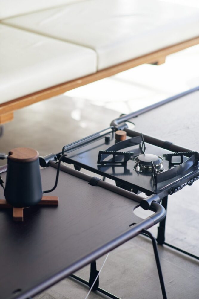 深いブラウンの木部で高級感のあるローテーブルのセット。各モジュール単体でも購入可。27万7750円※フルセット価格。グリルのみ他社製(エイチエックスオーデザイン https://shop.hxodesign.jp)