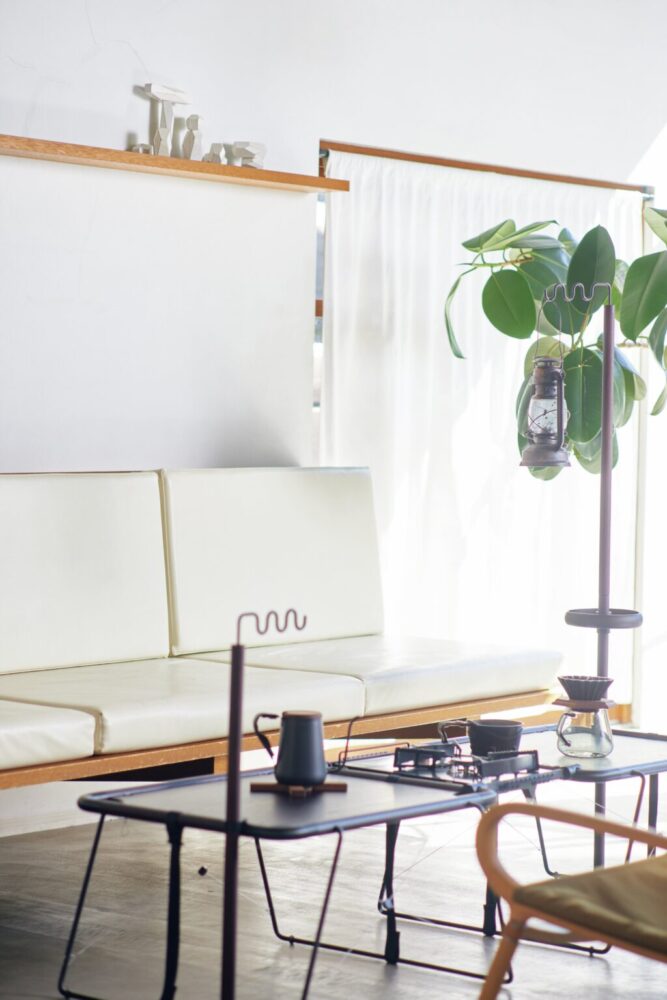 飾り彫りの上品な脚で、家の中でも馴染みやすいテーブル。脚はねじこみ式のため、取り外して天板裏のゴムバンドに留められる。2万2000円(アンプインテリアデザイン TEL03-6379-8675)
