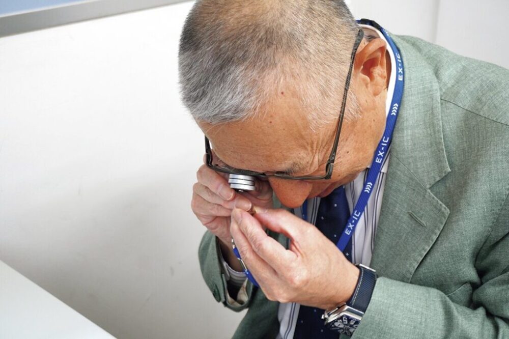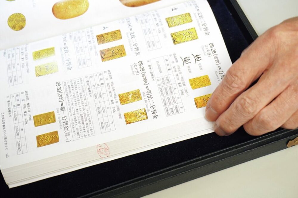 鑑定は「新橋スタンプ商会」で行われた。何処の馬の骨かもわからん怪きアタシと編集長のウエダくん、記録係兼スレイブのナマタメくんの3名を快く受け入れてくれたのは、社長の寺田さん。わざわざ社長さんが担当してくれることに驚いたが、さっそくアタシの二分金様を鑑定していただいたのだ。寺田社長は「お預かりします」と言うや、胸元からルーペを出して二分金様をじっと観察する。「まず、これは明治二分金と言われるもので、一番出物が多い二分金ですね」