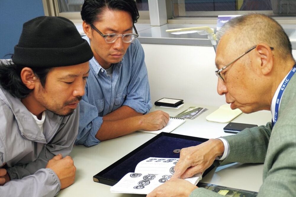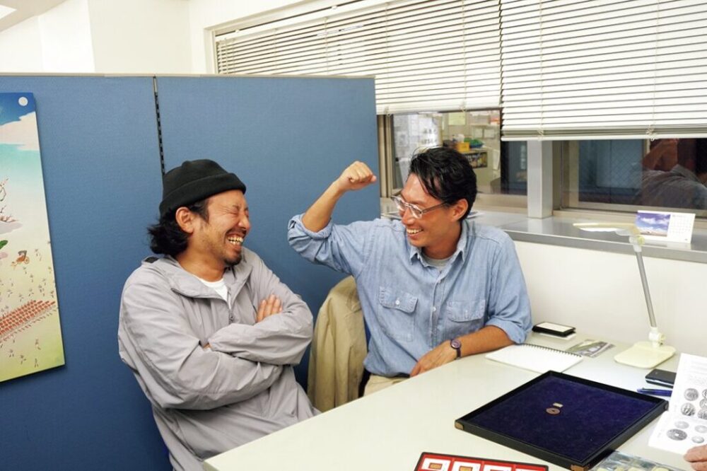 「うーん、ギリギリかなあ」と寺田社長。何がギリギリなんすか!「まあ、結論から言いますとこれは偽物ですね」ええー! マジっすか! 偽物なんてあるんですか!?「財政難の藩が銀にメッキした偽物も多いんですが、これは多分、真鍮製ですねえ」写真を撮っていたナマタメくんもウエダくんも、我慢出来ずに吹き出した。寺田社長は二分金様に彫られた「分」の字の違いや、スレでメッキがハゲている場所を見せてくれた。ああ、確かに違う。そして本物の明治二分金を見せられて確信する。