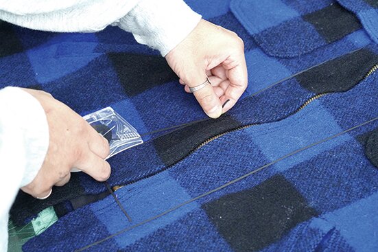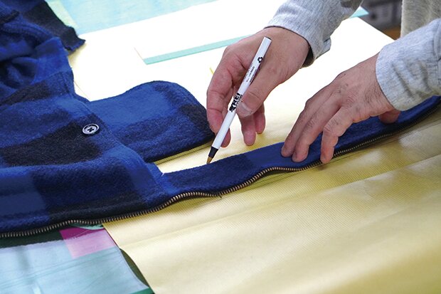 ジッパー部の見返しを外した裏地から切り出し、移植するため、型を取る。