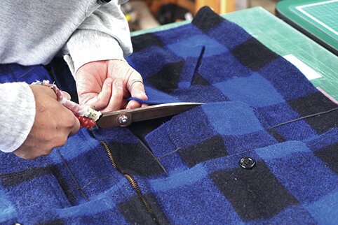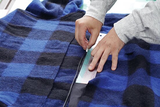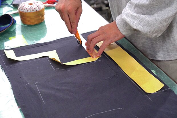 ジッパーの見返しに、ジッパー部分の型紙を合わせ、丁寧にカットする。