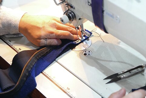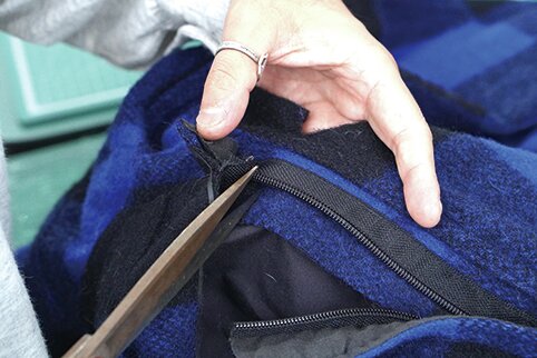 ジッパー部分に補強用の見返しを縫い付ける。歪みがあるので丁寧に。