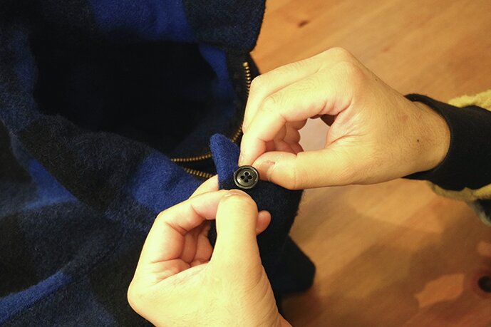 立ち襟仕様にもできるように、襟先にボタンとループを取り付けて完成!