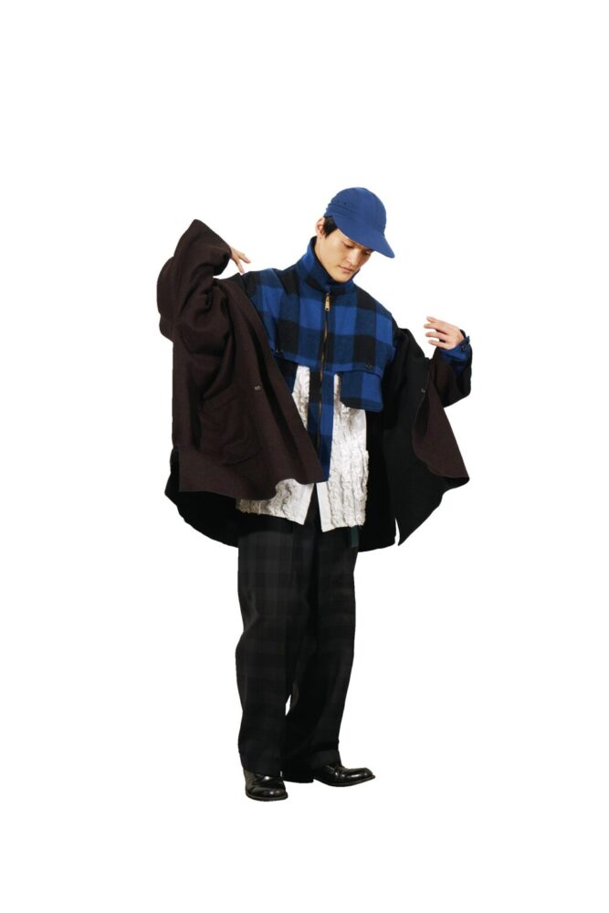 飯酒盃さん よくできてると思うよ。リョージにはこの話をもらった時に一度話をしたと思うけど、アメリカで出会った女性のディーラーがバッファローチェックのジャケットを短くリメイクしてたのを、10年くらい前に見てて、いつかやろうと思ってたんだよね。でも、なかなか機会がなくて、時間が経っちゃってたんだよね。この話が来た時にこれだって思ったよね。