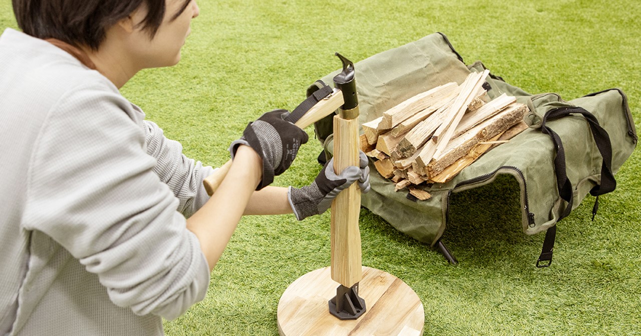 「薪割りクサビ」はポケットサイズながら、冬キャンプの醍醐味「焚き火」に欠かせない薪を、斧や鉈を使わずに割ることが可能。初心者や子ども、力に自信がない人におすすめの、薪割りのハードルを下げてくれる便利なアイテムとなっている。