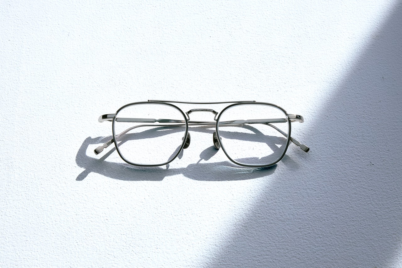 写真は「マツダ」の[M3149]。リム、ブリッジ、テンプルなどのメタル部分に施される細やかな彫金が、一見ナードな印象のツーブリッジデザインに高級感とただならぬ風格をもたらす。また、実はレンズの周りを囲むようにアセテート素材が巻かれており(業界ではセル輪っぱと呼ばれる)、肌馴染みの良さと柔和な雰囲気すらも持ち合わせる。いわゆるベーシックなツーブリッジデザインでありながら、細かなディテールで差別化を図った唯一無二の一本だ。11万2750円