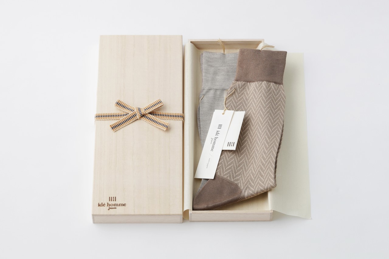 光沢感が美しいシルク無地とシルクにスーピマ綿を合わせた和柄風ヘリンボーンの2足セット。桐箱に真田紐をかけたギフトパッケージになっています。