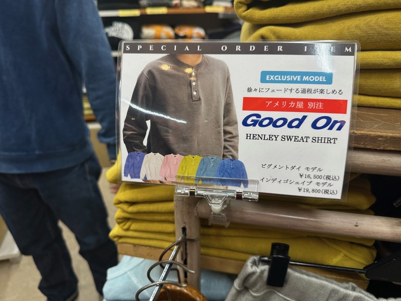 A : ヘンリーネックのスウェットがグッドオンのインラインに無かったのと、もともとアメリカ屋ではヘンリーネックはグッドオンに限らず常に人気のアイテムだったのがきっかけです。