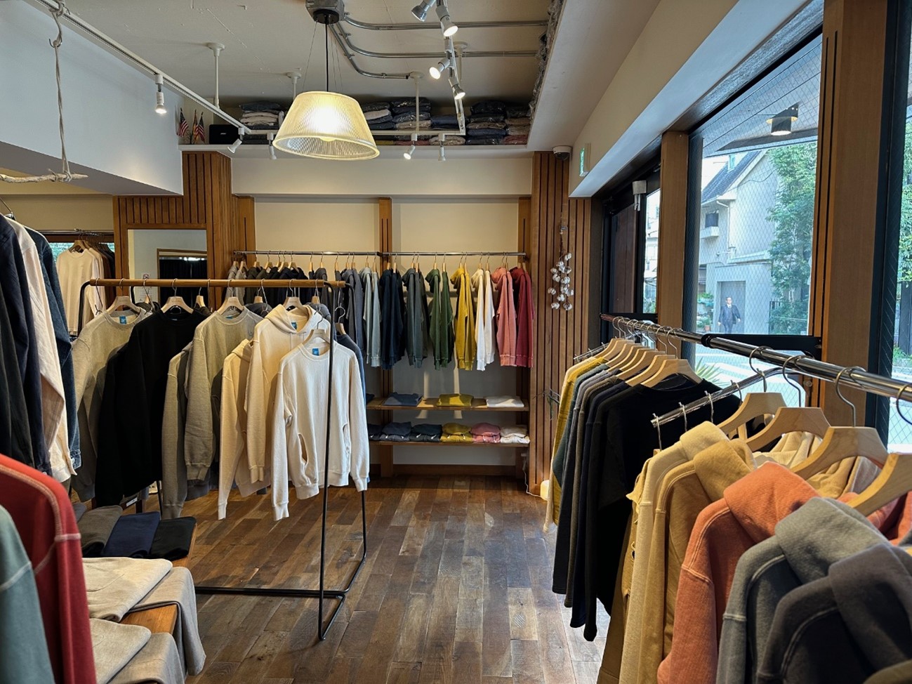 旗艦店がオープンしたのは今から7年前の2018年です。恵比寿の住宅街にひっそりと佇む店舗では、毎年リリースされている定番のカットソーに加え、沢山のカラーバリエーションがあるため、初めてご来店されたお客様は大概、悩まれる方が多く、ゆっくりとショッピングが楽しめる雰囲気になっています。また知識豊富なスタッフが商品の特徴やコーディネイト術について詳しくアドバイスもしています。
