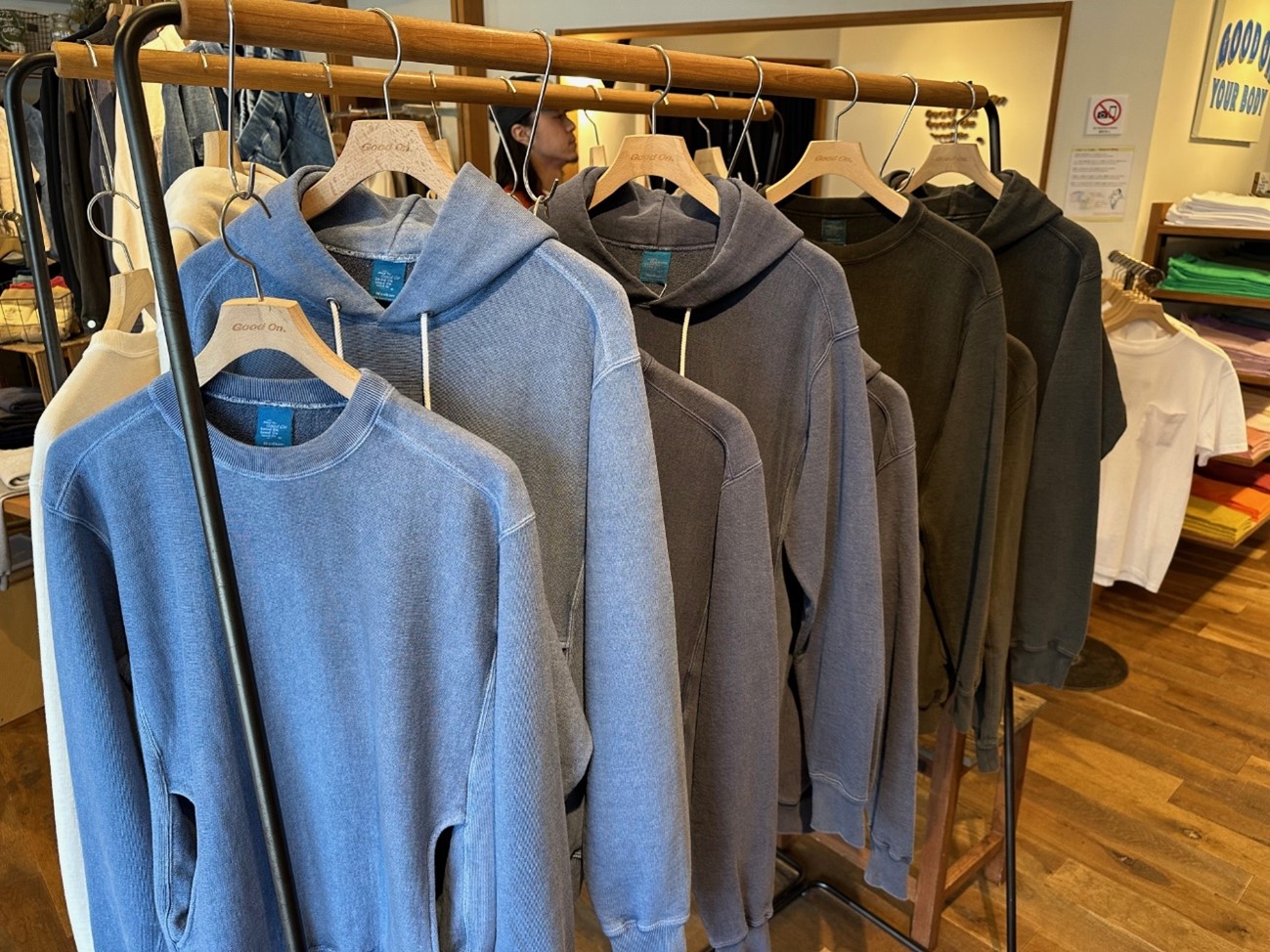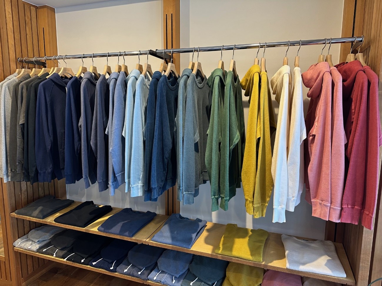 こちらの商品は秋から春にかけて展開しているスウェットシリーズになります。程よい厚みで編み立ててあり、裏地もフレンチテリー(パイル状)にしてあるため、3シーズン快適に着用でききます。春用にはさらに新色を増やすので、非常に賑やかな店内になります。