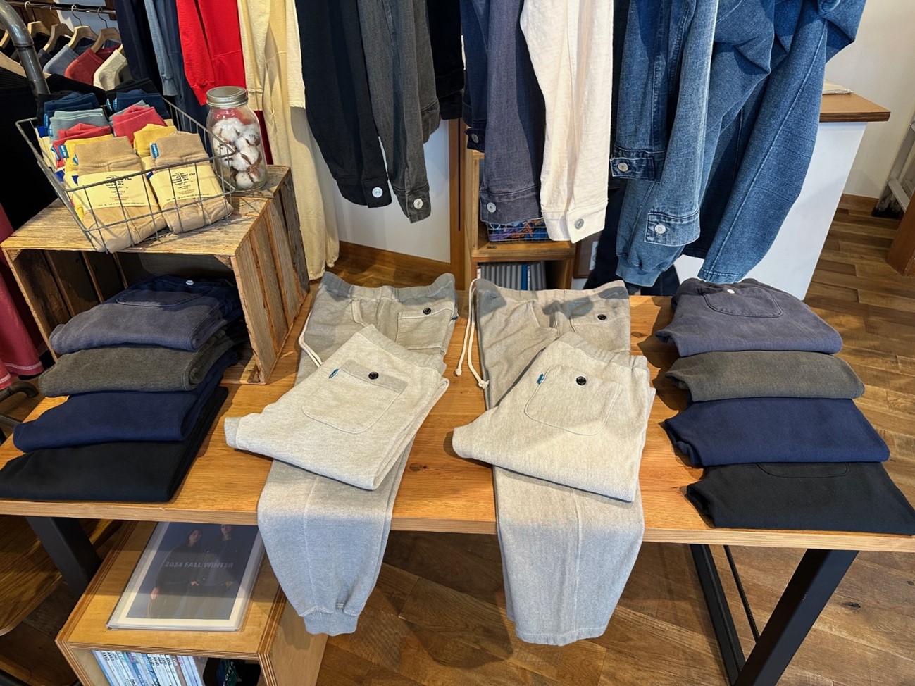 旗艦店での人気商品は他にもございます。こちらを求めてわざわざご来店いただくお客様も多いのがスウェットパンツです。人気の秘密は、安心して街履きできる厚みのある生地です。加えて、綺麗なラインで履いていただけるシルエットも人気の秘密です。リピート買いも非常に多いです。