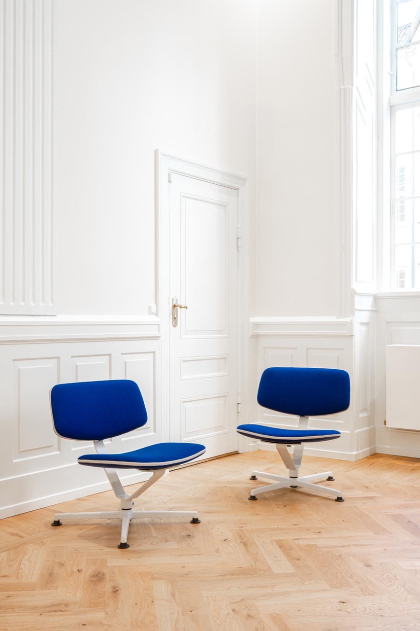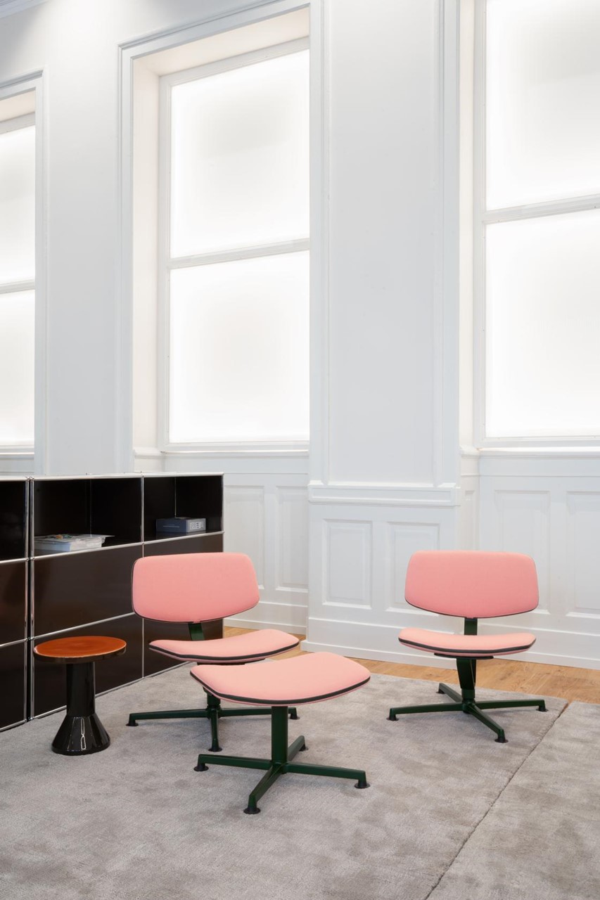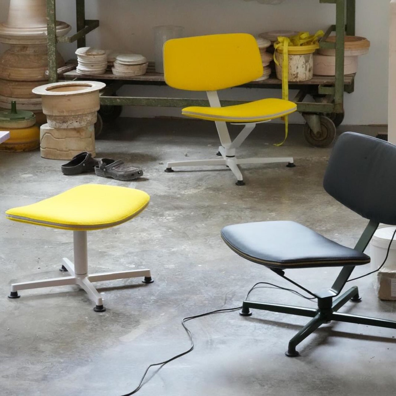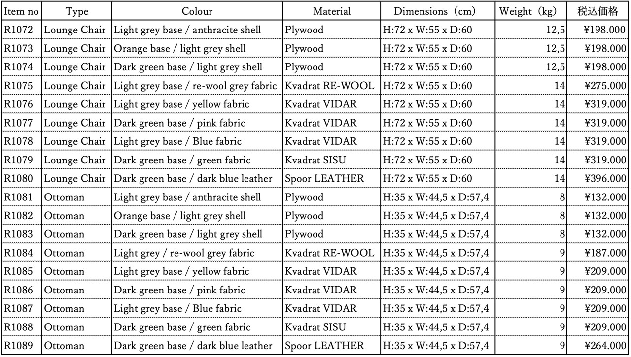 ベースには複数のカラーが、座面と背もたれには成形合板、塗装、Kvadrat社のテキスタイルの布張り、SPOOR社のレザー張りなどさまざまなバージョンがあるほか、オットマンも用意されている。