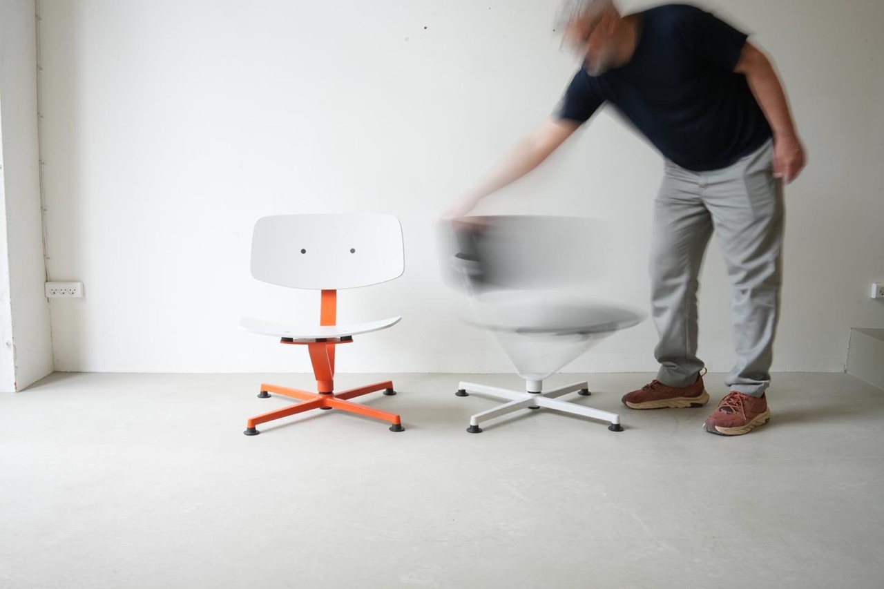 座面と背もたれは完璧な形と位置で、背骨のように絶妙な角度に曲げられた中央の金属板は、カンチレバー特有のダイナミックな動きを加え、ベースは快適な回転機能を有する。このチェアは、実験的なプロトタイプの形状を忠実に保ちつつ、熟慮を重ねて精密に作られた工業製品である。