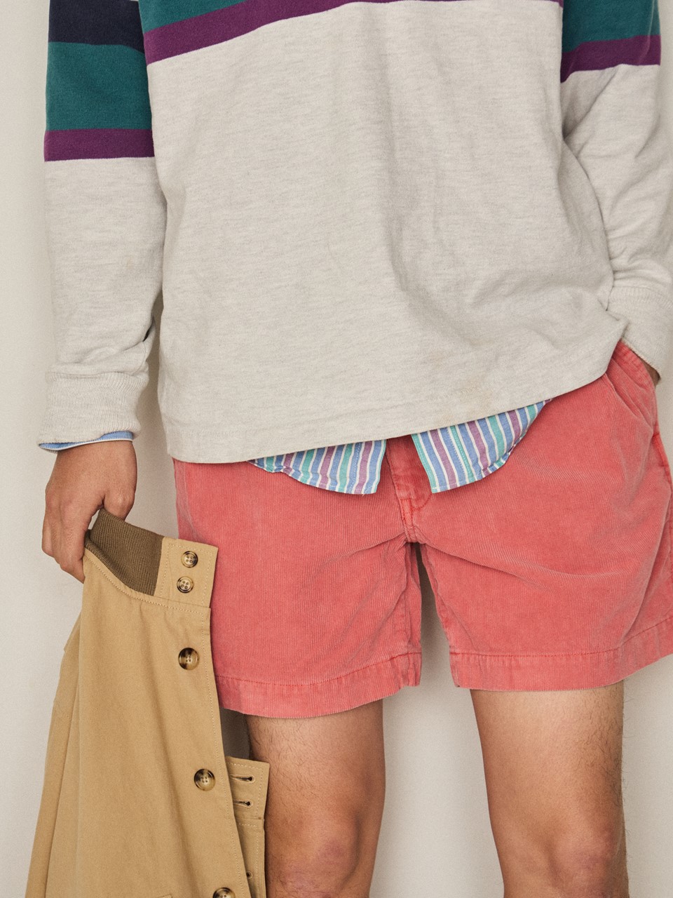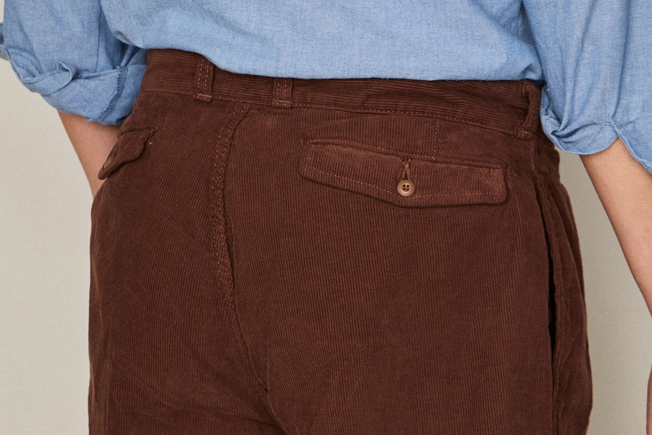 フレンチアーミーらしい秀逸なシルエットは踏襲しつつ、素材をコーデュロイに変更している。コーデュロイといえば秋冬のイメージが強い方も多いと思うが、畝があることで実は吸水性と速乾性に優れた春夏向きの素材でもあるのだ。1970年代のサーフスタイルを見てもコーデュロイショーツは定番的なアイテムになっている。