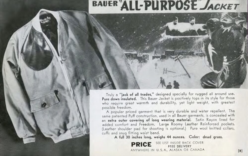 名前が示す通り、「オールパーパス」はあらゆる天候やシチュエーションに対応するダウンジャケットとして開発された。その背景は当時のカタログにも如実に表れている。1940年代版のカタログには、悪天候のなか電線工事をする男性の姿が描かれ、1960年代になるとパイプをくわえる優雅なイラストへと差し替えられているのだ。仕事着でもあり日常着でもある、そんな“多用途さ”を体現する一着であることがうかがえる。