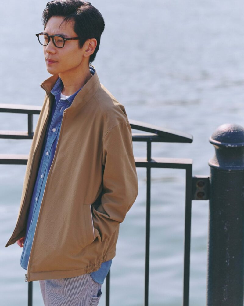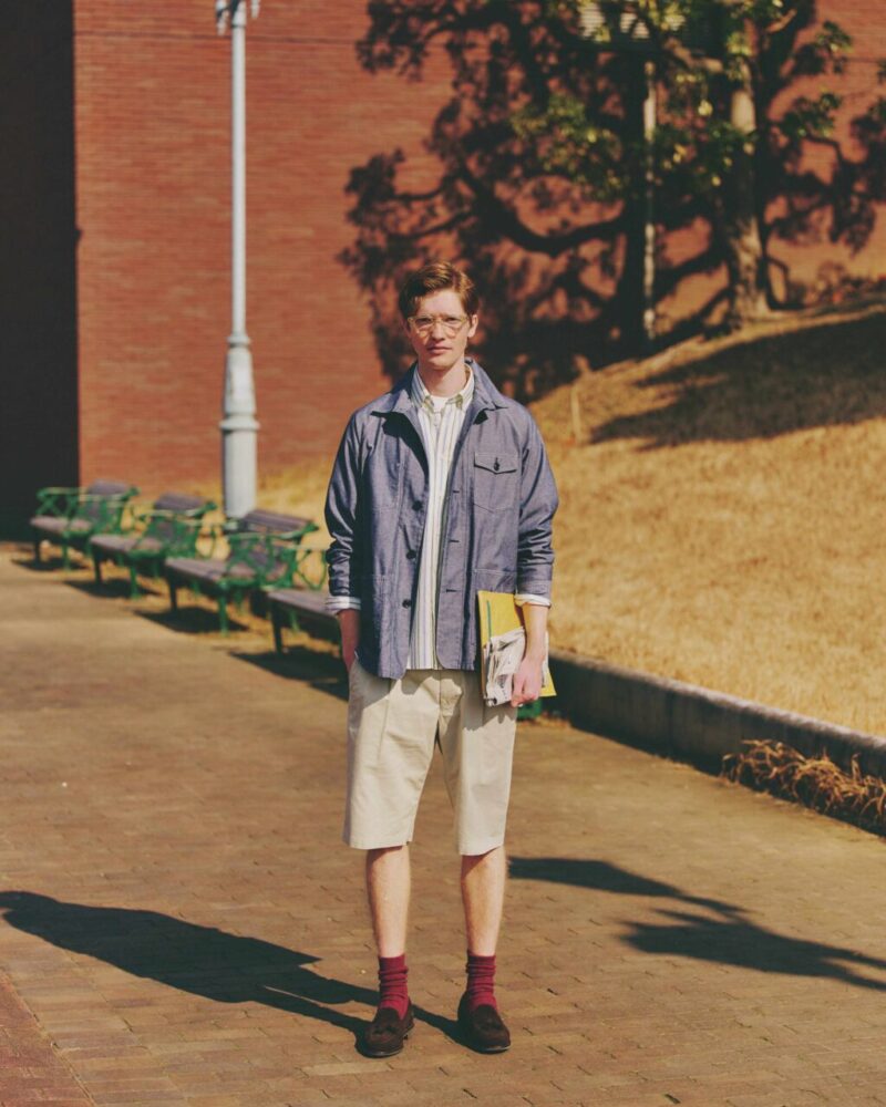 武骨であるはずのワークジャケットも、シャンブレー生地なら軽やかに。イエロー×ブルー×ホワイトのストライプシャツと、綿ポリウレタンのショーツが春らしさを後押しする。