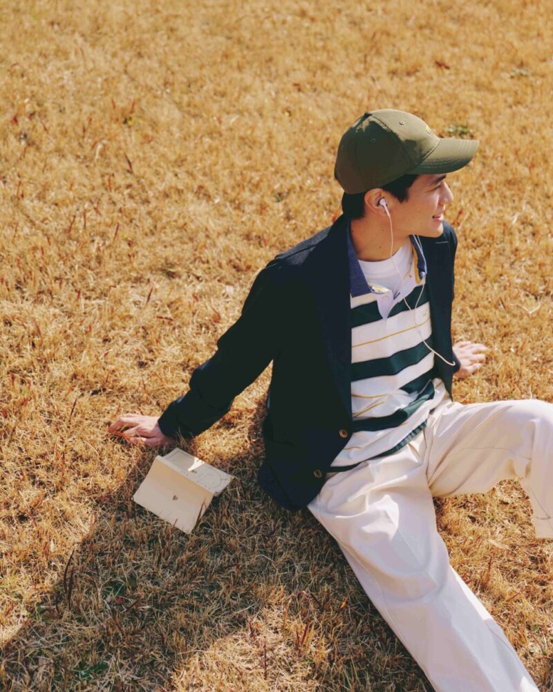 トラッド見えするジャケットは、実はカットソーカーディガンでストレスフリー。ラガーシャツをインナー使いした定番のアイビースタイルには、刺繍入りのキャップで遊び心をプラス