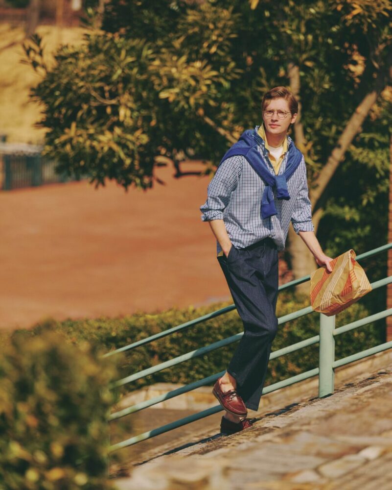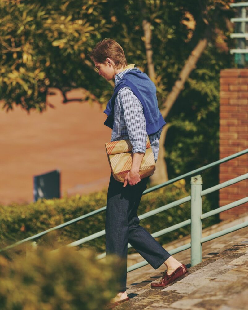 お手入れ簡単で気負わず着られるガンクラブチェックのBDシャツには、鹿の子ポロを合わせて王道プレッピー。綺麗なシルエットのデニムスラックスなら子どもっぽく見えることもない