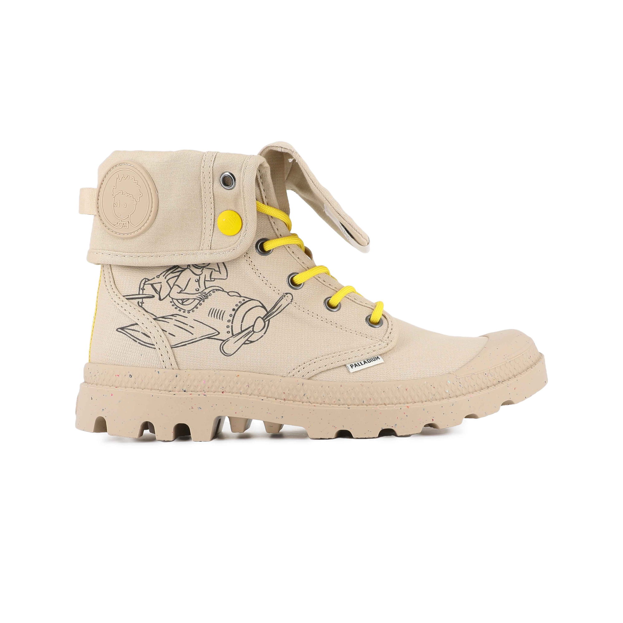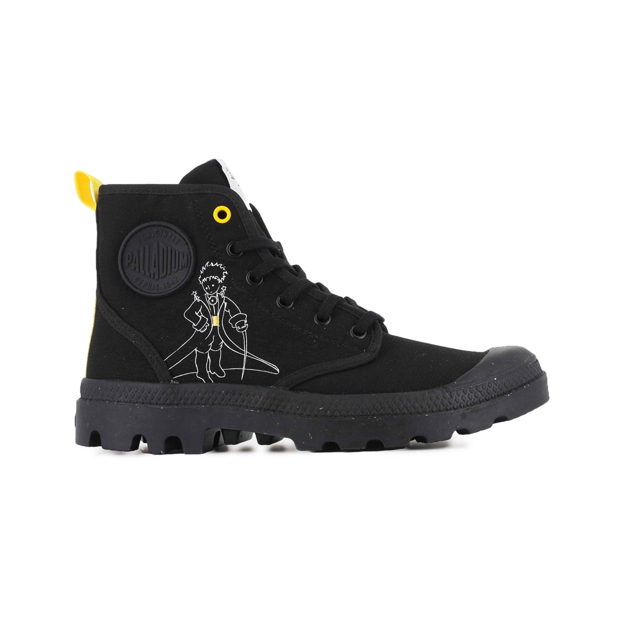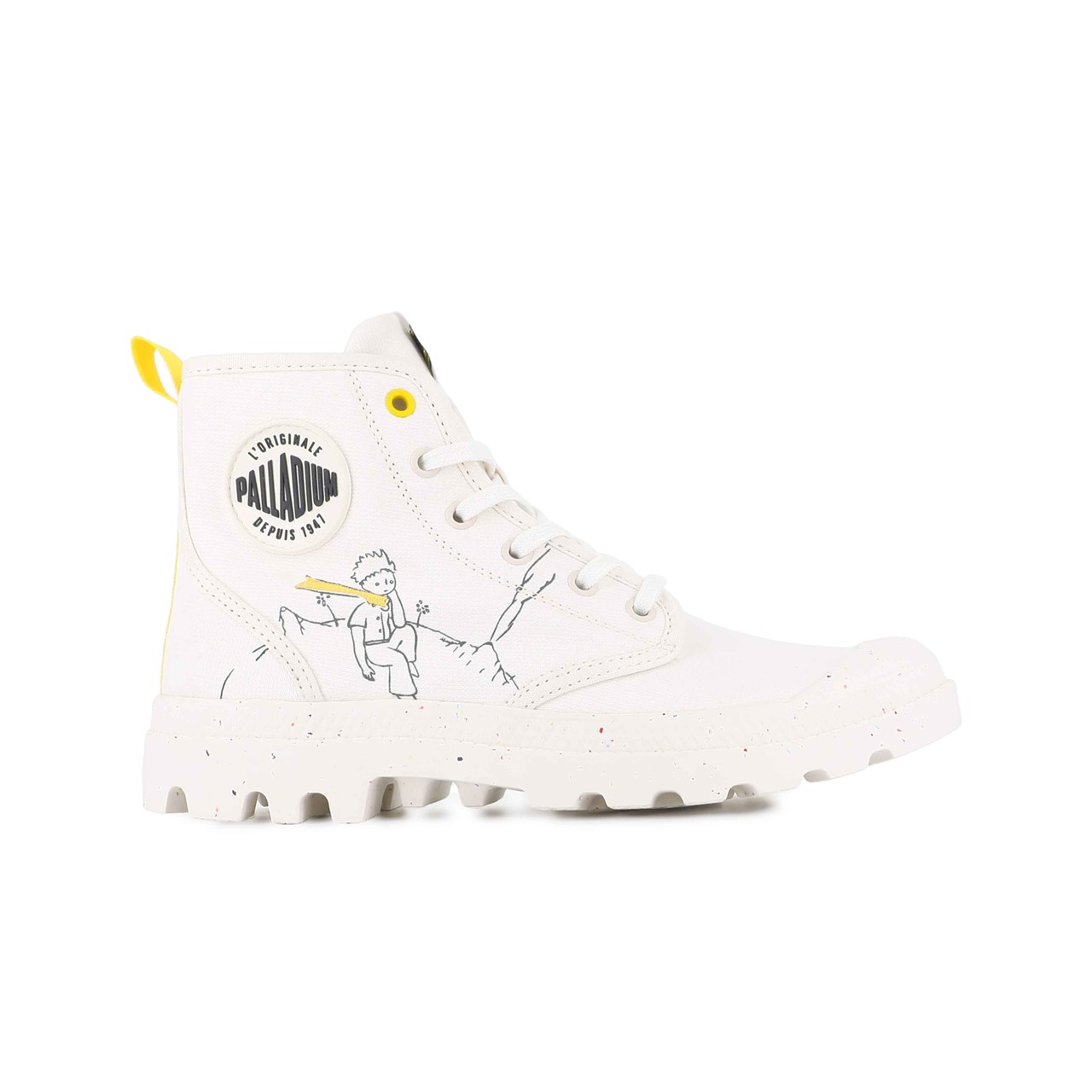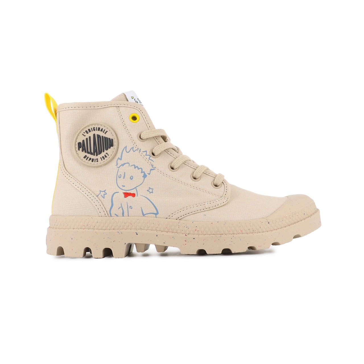 アイテムは「パラディウム」伝統のシルエットである2タイプのブーツがベースに。ひとつはパラディウムの伝統でデザートブーツの原型のひとつとも言われるPAMPA(パンパ)。ハイカットシルエットと凹凸のアウトソールが特徴で、フランスの外国人部隊が行軍に着用したというヒストリーと相まって、パラディウムのミリタリールーツを今に伝えるアイテム。アッパーに刺繍やプリントで王子さまを配置している。