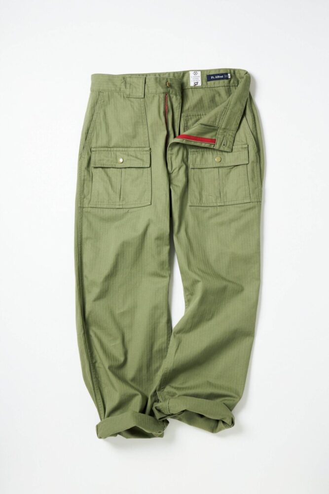 Pt.アルフレッドの定番ファティーグパンツをベースに生地を1940年代のミリタリーウエアのレプリカヘリンボーンに変更し、フロントにフラップポケットを追加。さらにベルトループをやや太めに設計し、そのほかにもボタンの仕様やジップ周りの赤のラインなど八木沢さんらしいエッセンスも感じられます。何より、このふたつのネームが並んでいることに興奮を隠すことができません。4月上旬発売予定。