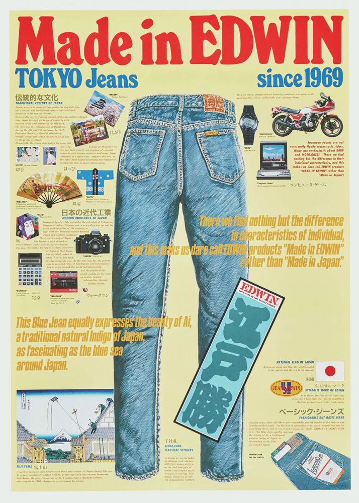 戦後であった当時は、東京上野のアメ横は食料品や中古衣料品のマーケットとして栄えていたのである。その後、常見米八商店は米国から中古ジーンズの輸入、販売店への供給を行ったが、米国製のジーンズが日本人のフィッティングと合わないことを知り、それがジーンズを作るきっかけとなる。そして1961年に「エドウイン」としてブランドをスタート。モノづくりはもちろんのこと、印象的なビジュアルやキャッチコピーもブランドの発展に大きく寄与した。