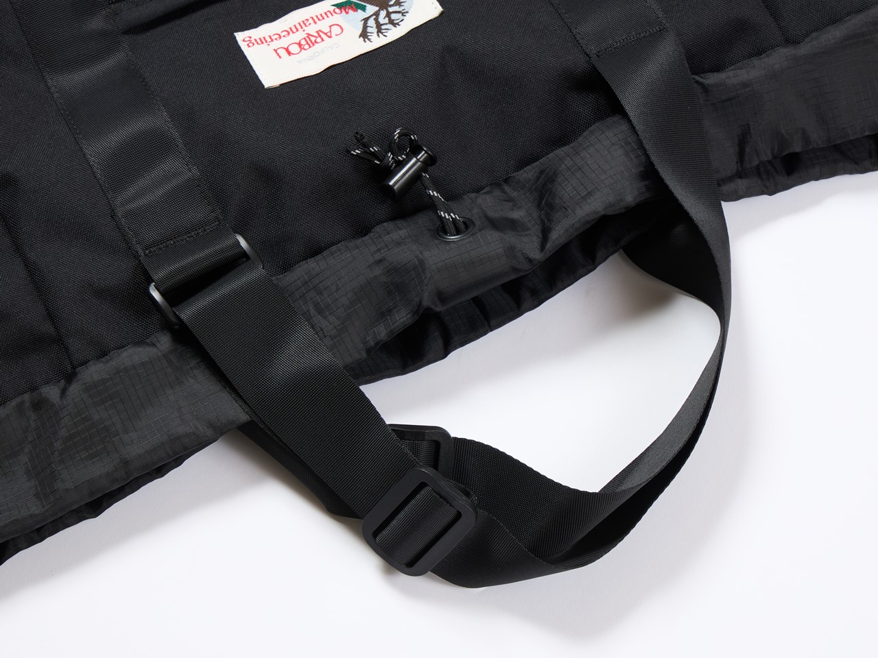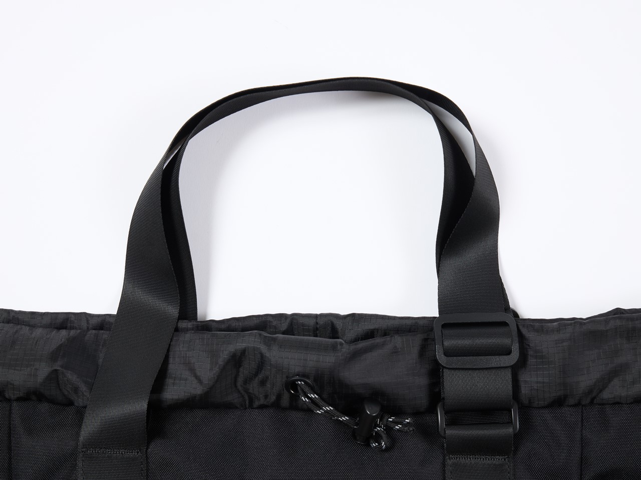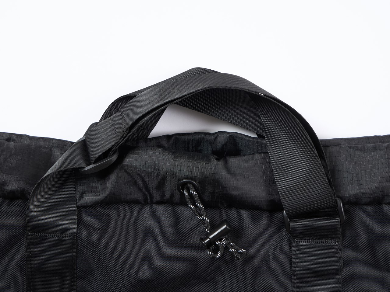 バッグの開き口部分にはストラップが付属しており、ここを引っ張って留めると大き目の巾着バッグに。バックパックとして使用する際のシルエットアレンジとしても◎。