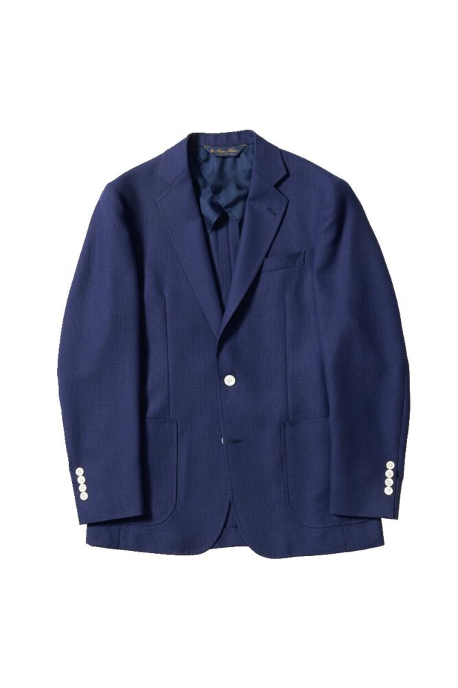 愛知県尾州地方の老舗生地メーカー「イチテキ」が製作したホップサックの生地を使用。裏地や肩パッドなどの付属を最小限に抑えた軽やかな仕様。白蝶貝のボタンがアクセントだ。8万1400円