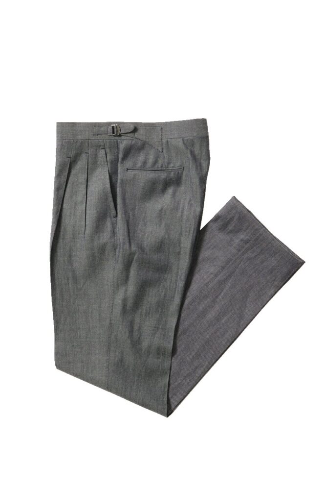 世界的なパンツファクトリーブランド「イガラシトラウザーズ」にて製作。反応染めの糸を綾織りでデニム調に仕上げた生地で絶妙な奥行きを表現。「ジャパントラッド」より展開。5万9400円