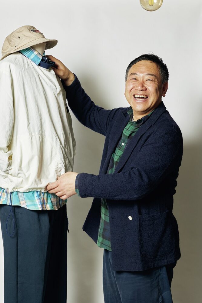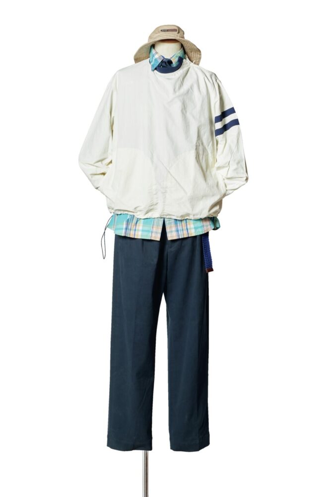 マドラスチェックシャツ2万2000円、ネイビーチノ2万4200円、クレストタイ1万4300円(すべてD.C.ホワイト)、トレーニングシャツ1万8900円(アトランティックフィールド)、バケットハット(石原さん私物)
