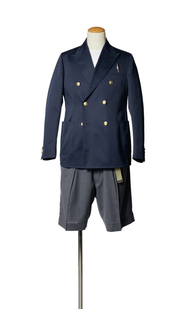 ネイビーブレザー5万5000円、2枚入りのパックTシャツ9680円、ショートパンツ2万2000円(すべてD.C.ホワイト)、ベルト(石原さん私物)