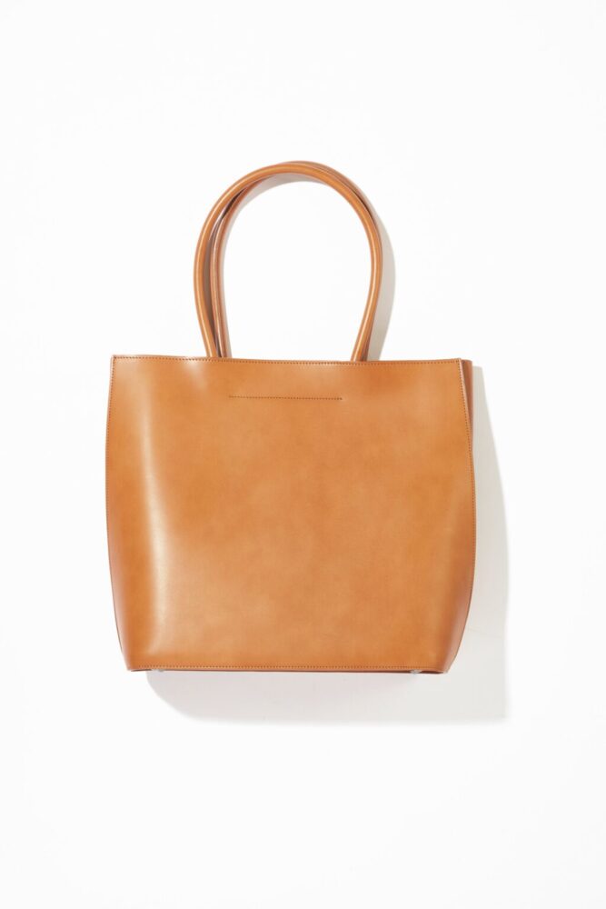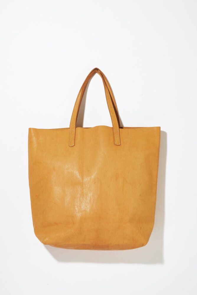 1枚革で仕立てたシンプルなデザインのトートバッグ。特筆すべきはその軽さと、畳んで持ち運ぶこともできる程に柔らかいゴートレザー。オン・オフ問わないシンプルな見た目は、日常使いはもちろん、旅行でのサブバッグまでと守備範囲は広い。機能的でありながら、レザーらしい経年変化も楽しめるオールマイティなトートだ。4万2900円(マッハ 55 リミテッドTEL03-5846-9535)
