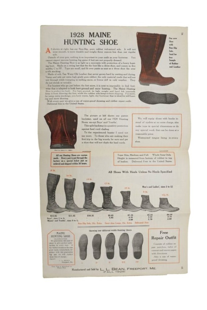 「ORA」に収蔵されていた「エル・エル・ビーン」のカタログのなかでも、最高に格好良かった1926年と1928年のカタログをピックアップ。1928年の「ビーンブーツ」のページを見ていく。この当時、モデル名は[メイン・ハンティング・シュー]。ブーツの高さも7段階選べた。カタログ中央左あたりの赤枠の中に「注文受付後から36時間以内に出荷がします」と記載があり、現代で考えるとカスタムオーダーの靴が1週間以内に届くなんて驚きだ