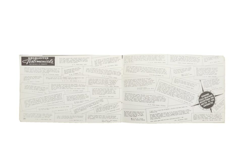 弊誌でも特集を組んだことのある「エディー・バウアー」のカタログももちろん保管されていた。 1940年代のカタログにはアイテムの他に、ブランド愛好者の声、現代で言うとレビューが掲載されている。インターネットがない時代、人から人への口コミによって売れるものが変わっていた時代。それは現代でも変わらないが、こういったカスタマーの声は本当に貴重だったのだとブランド側が思っていたことが伝わるページだ。
