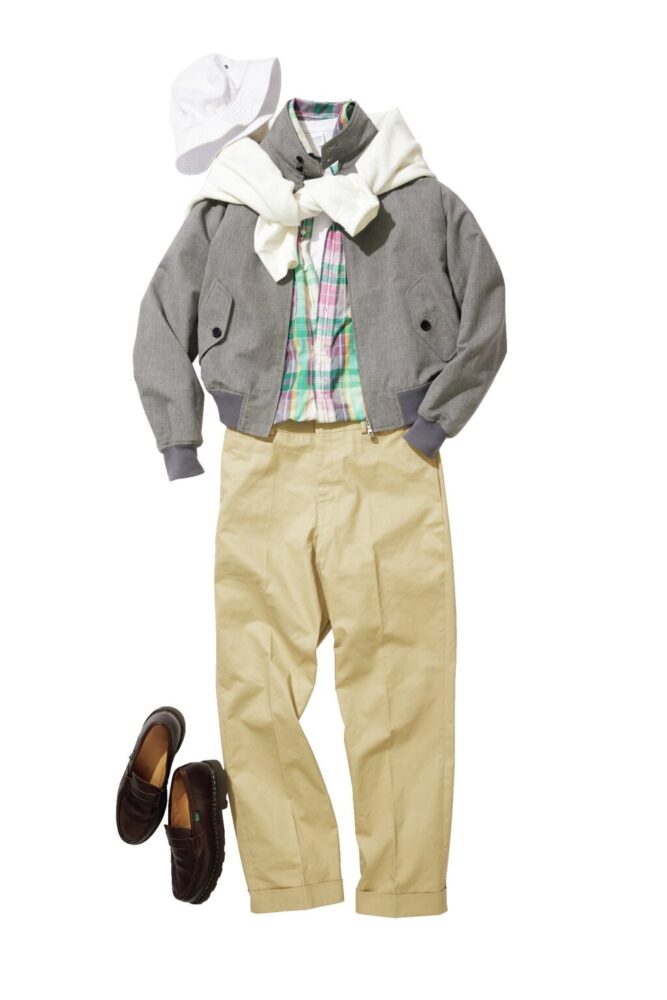 吉村 ハリントンジャケットなので、キャップだとスポーティすぎるかなと思って、バケットハットにしました。バケハは本当になんにでも合う最強の帽子です。あとは、プレッピー定番の“肩になにかを巻く”。スポーティなジャケットに合わせて、セーターではなくスウェットにしました。ハットもスウェットも、全体を淡くしたいという今の気分に合わせて、白でワントーンにまとめています。