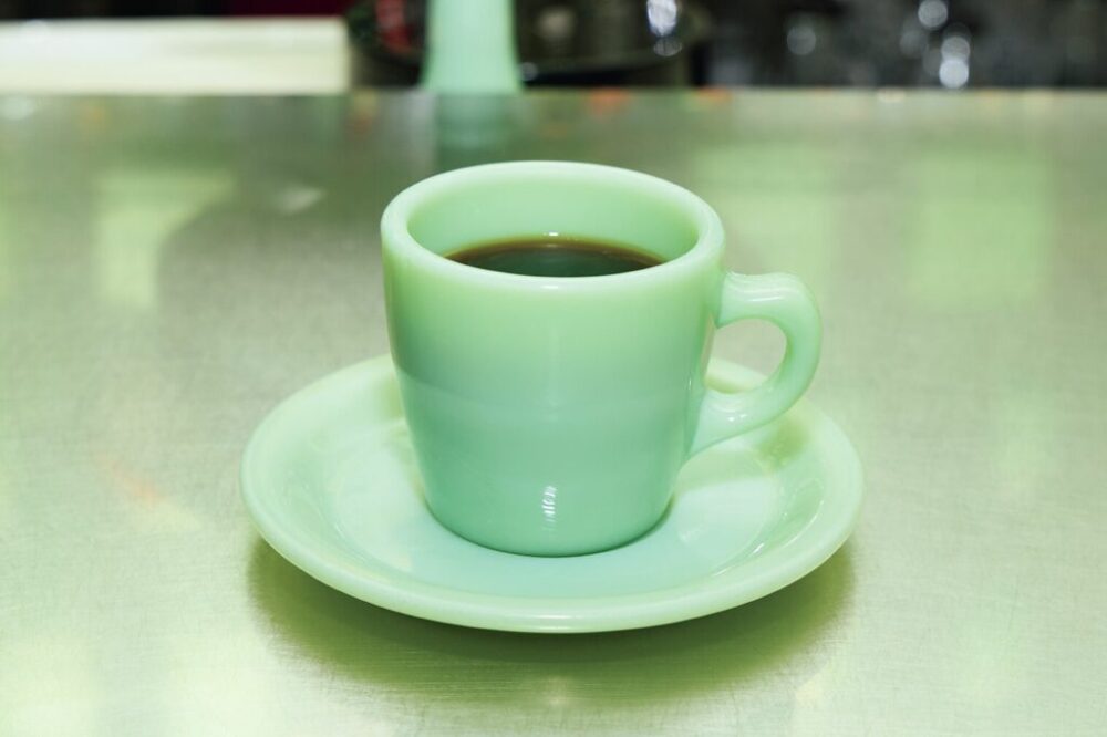 今回のテーマは第1回ということで、“初めてのデート”。トラッドマンたるもの、最初は落ち着いたカフェにエスコートすべし。「俺は1回目から飲みに誘う! しかも夜に!」というミウラシュランのような強者(つわもの)もいるだろうが、下心がバレて断られる可能性もある。であれば、まずはカフェでのランチが無難だ。ということで、今回彼が紹介するのは代々木上原駅すぐ近くの『ファイヤーキングカフェ』。ここでは、落ち着いた大人の空間のなか、アメリカの耐熱ガラス食器メーカーの先駆け〈ファイヤーキング〉のカップでお茶を楽しむことができる。「多い時は週に2〜3回来るくらい好きなお店! フードも美味しいし、店内のアートも雰囲気があっていいんだよね〜。そしてなんといってもファイヤーキングのグラスでコーヒーが飲める! ファイヤーキングの話から古着や洋服の話に持ち込んで、2回目の買い物デートに繋げるべし!」