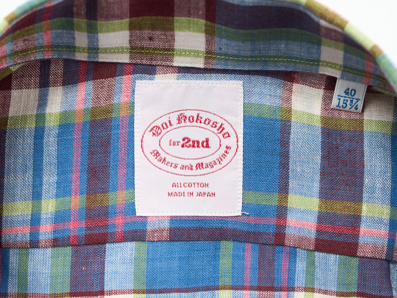 1952年に創業したメイドインジャパンのドレスシャツファクトリー〈土井縫工所〉とのコラボタグ。1960年代頃のタグをイメージし、”綺麗過ぎない”ように作ってもらっています。作り手と雑誌(=2nd)を意味する[Makers and Magazines]の文字が入るスペシャルなタグです。